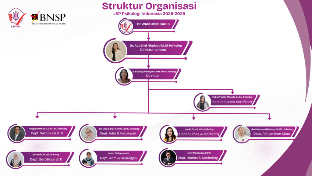 Struktur Organisasi PT LSP Psikologi Indonesia tahun 2025-2029 berdasarkan SK No.006/PT.LSP-Psi/SK/IX/2025